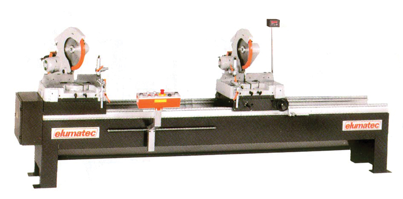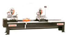 An exceptionally robust double head mitre saw, ideal for large volume sawing applications. Mitre cuts of 90 and 45 degrees, with optional intermediate angle selection available. Length setting is manual, with the E111 length measuring readout and a hand wheel. Switching of the saw head from 90 to 45 degrees is completed with a simple switch on the control panel. Two hand safety controls, and automatic, inter-locked safety hoods on both sawing heads are standard.